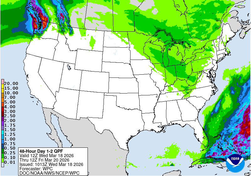 In the South, a warming trend has commenced west of the Mississippi Delta. In the Southeast, however, freezes were observed again Wednesday morning as far south as northern Florida, with possible implications for winter grains, blooming fruits, and already emerged spring-sown crops. On Tuesday, daily-record minimum temperatures included 19°F in Fayetteville, Arkansas; 26°F in Anniston, Alabama; 27°F in Jackson, Mississippi; and 32°F in Baton Rouge, Louisiana.