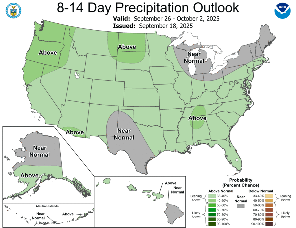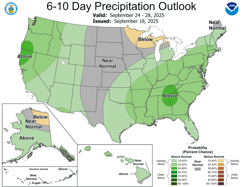 Meanwhile, near- or above-normal precipitation across the West, South, East, and lower Midwest should contrast with drier-than-normal conditions from the central and southern Rockies into the upper Midwest, including large sections of the Plains.