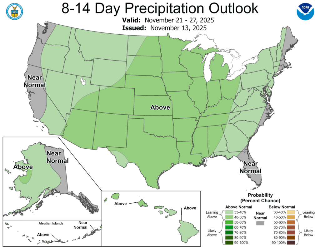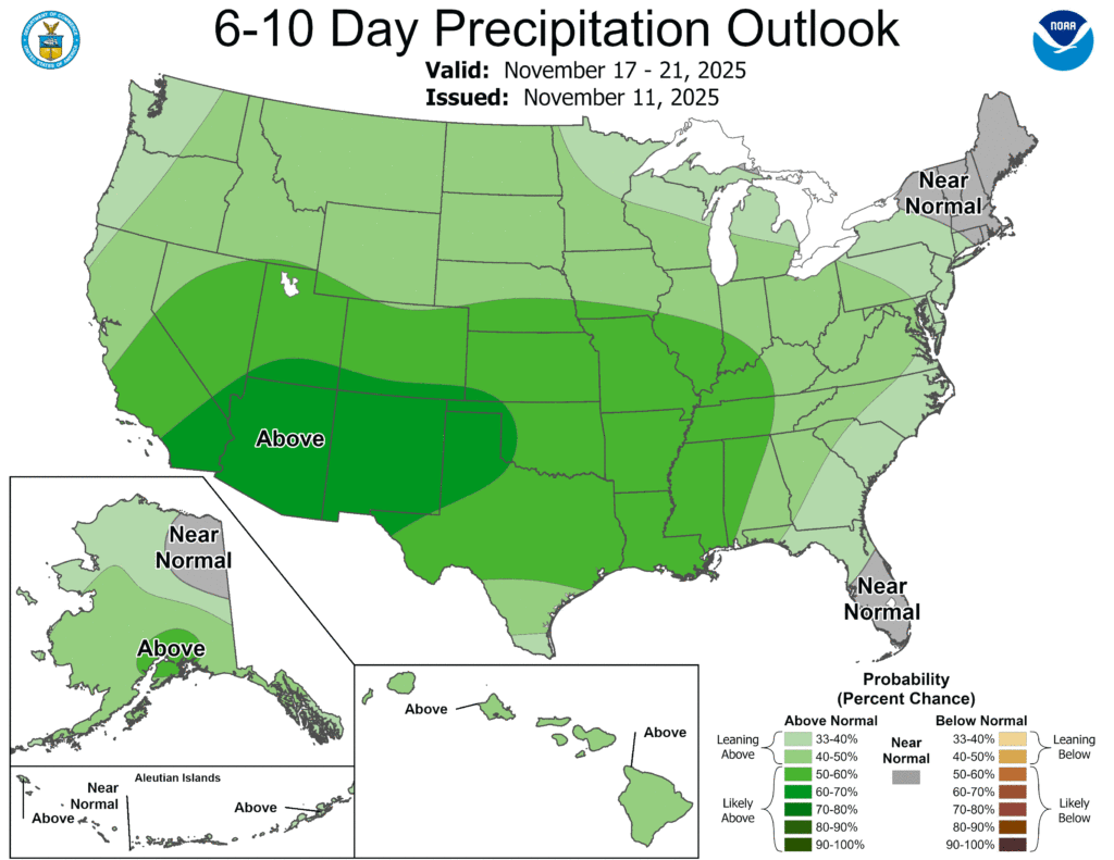 Meanwhile, wetter-than-normal weather will prevail nationwide, except for near-normal rainfall along the southern Atlantic Coast and near- or below-normal precipitation in New England and northern New York.